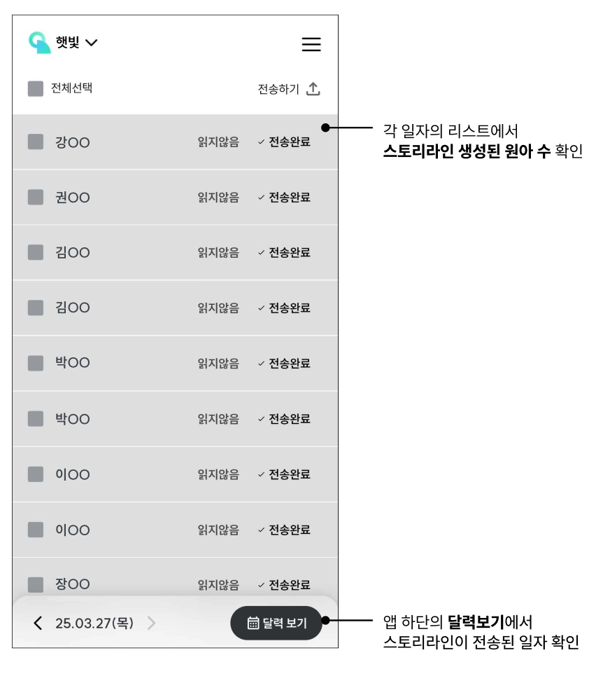 → 스토리라인 앱 > 캘린더에서 전송된 날짜 수와 원아 수를 확인해주세요.