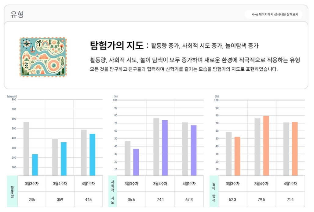 따라서 서비스 시작이 늦은 학급의 경우에는 ‘새학기 적응’ 리포트 대신, 아이의 개개인의 지표 변화와 놀이 선호도의 추이 중심으로 한 새로운 유형의 리포트를 제공해드릴 예정입니다. 해당 리포트 제공 일정은 [공지사항]을 통해 별도로 안내해 드리겠습니다.