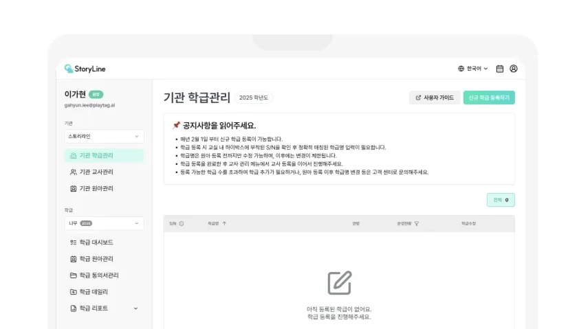 학급 등록 및 관리는 스토리라인 웹에서 진행할 수 있습니다.