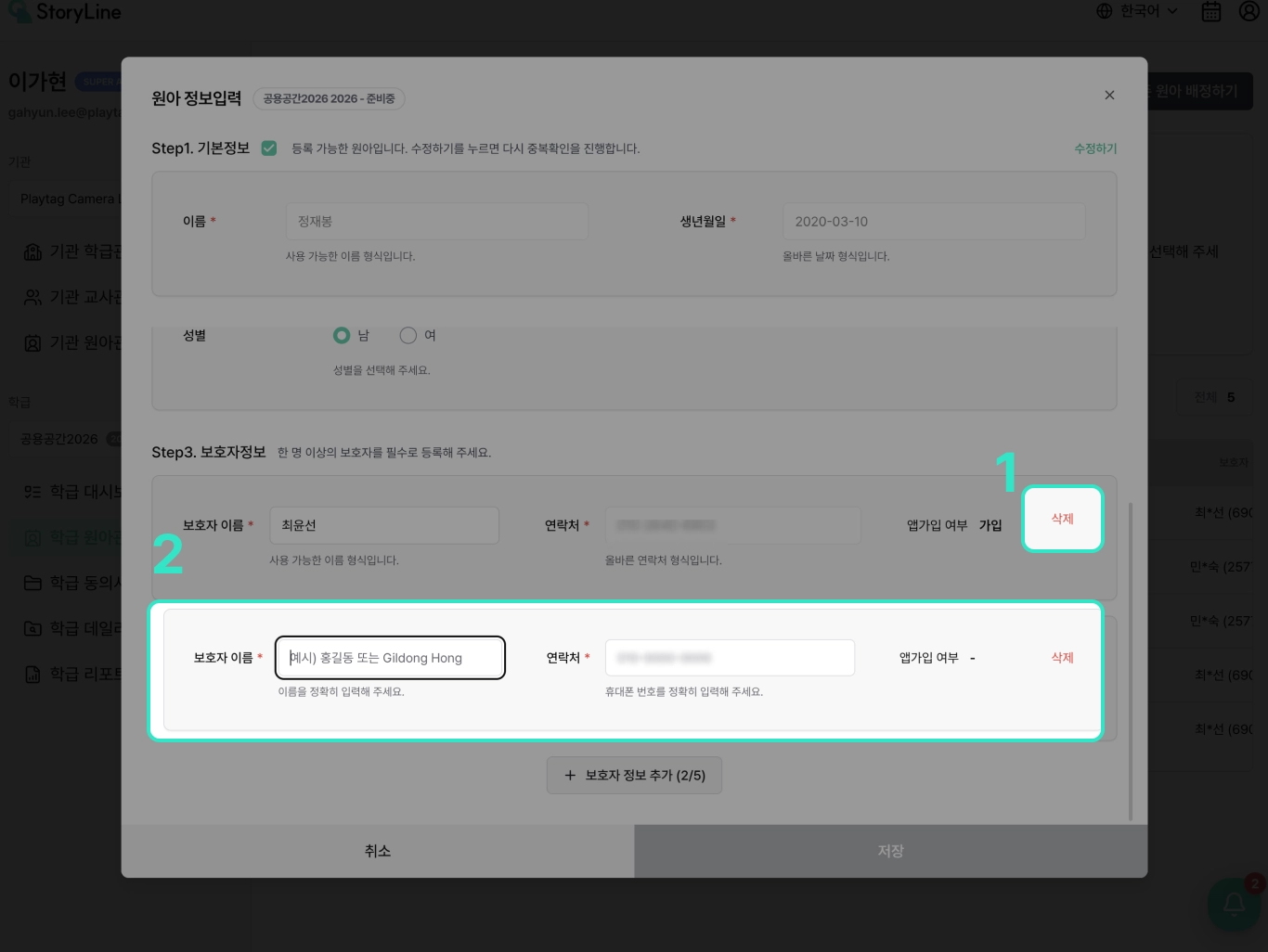 기존 보호자의 연락처 수정/ 삭제를 위해 [보호자 정보 추가] 버튼 클릭이 필요합니다.