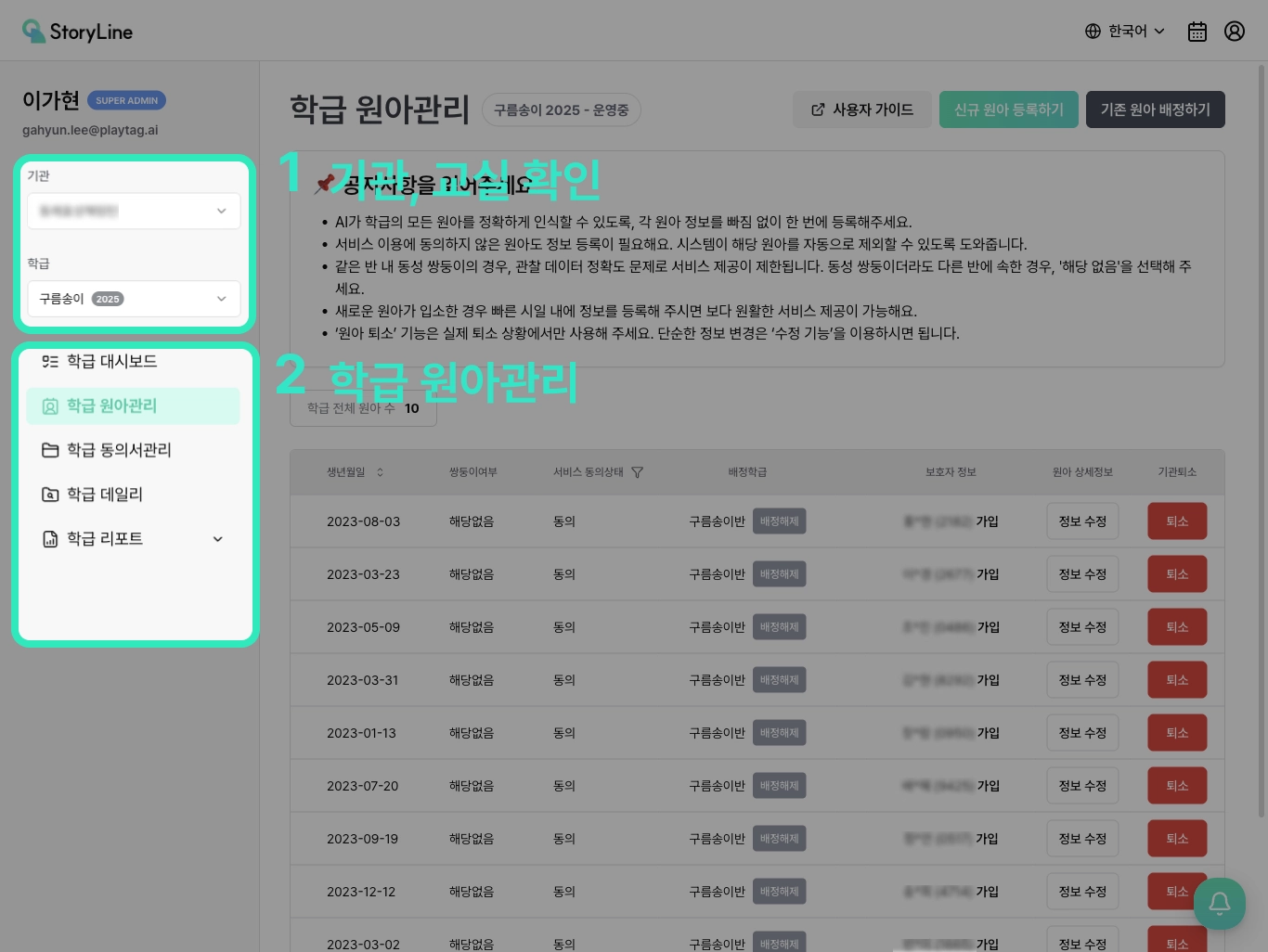 보호자 등록할 원아의 [정보 수정] 버튼 클릭