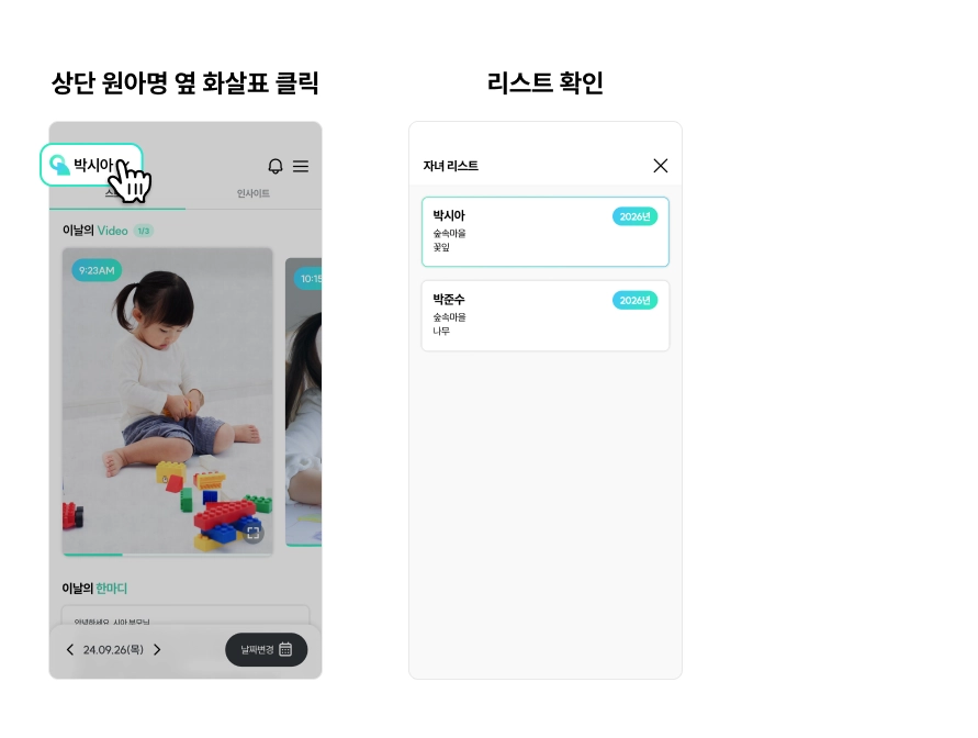 상단의 화살표를 누르면 다른 자녀를 볼 수 있습니다.