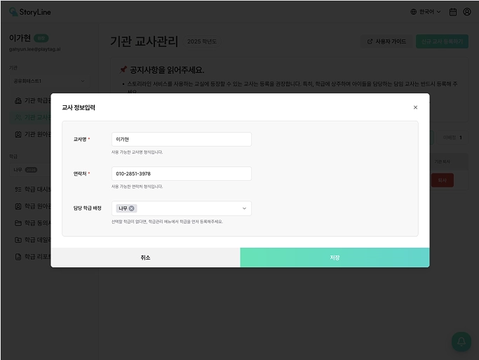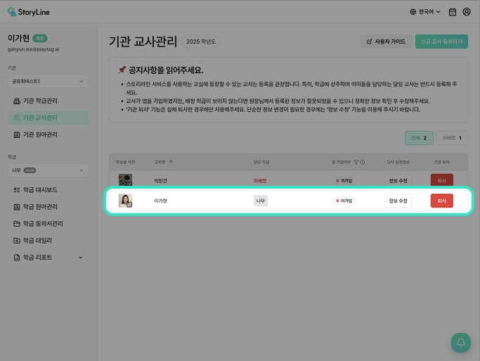 스토리라인 서비스를 사용하는 교실에 등장할 수 있는 교사는 등록을 권장합니다. 특히, 학급에 상주하며 아이들을 담당하는 담임 교사는 반드시 등록해 주세요. 등록되지 않은 사람이 영상에 포함될 경우, 교사 인식 오류가 발생할 수 있습니다.