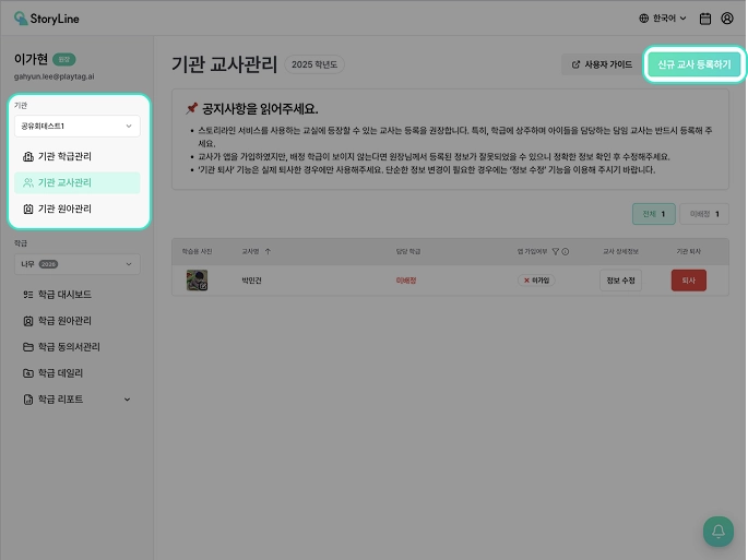 스토리라인 웹에서 [기관 교사관리]에서 등록하실 수 있습니다.
