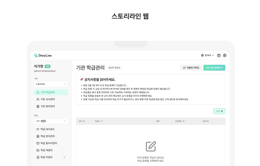 스토리라인 웹에 로그인하여 학급 관리 시작