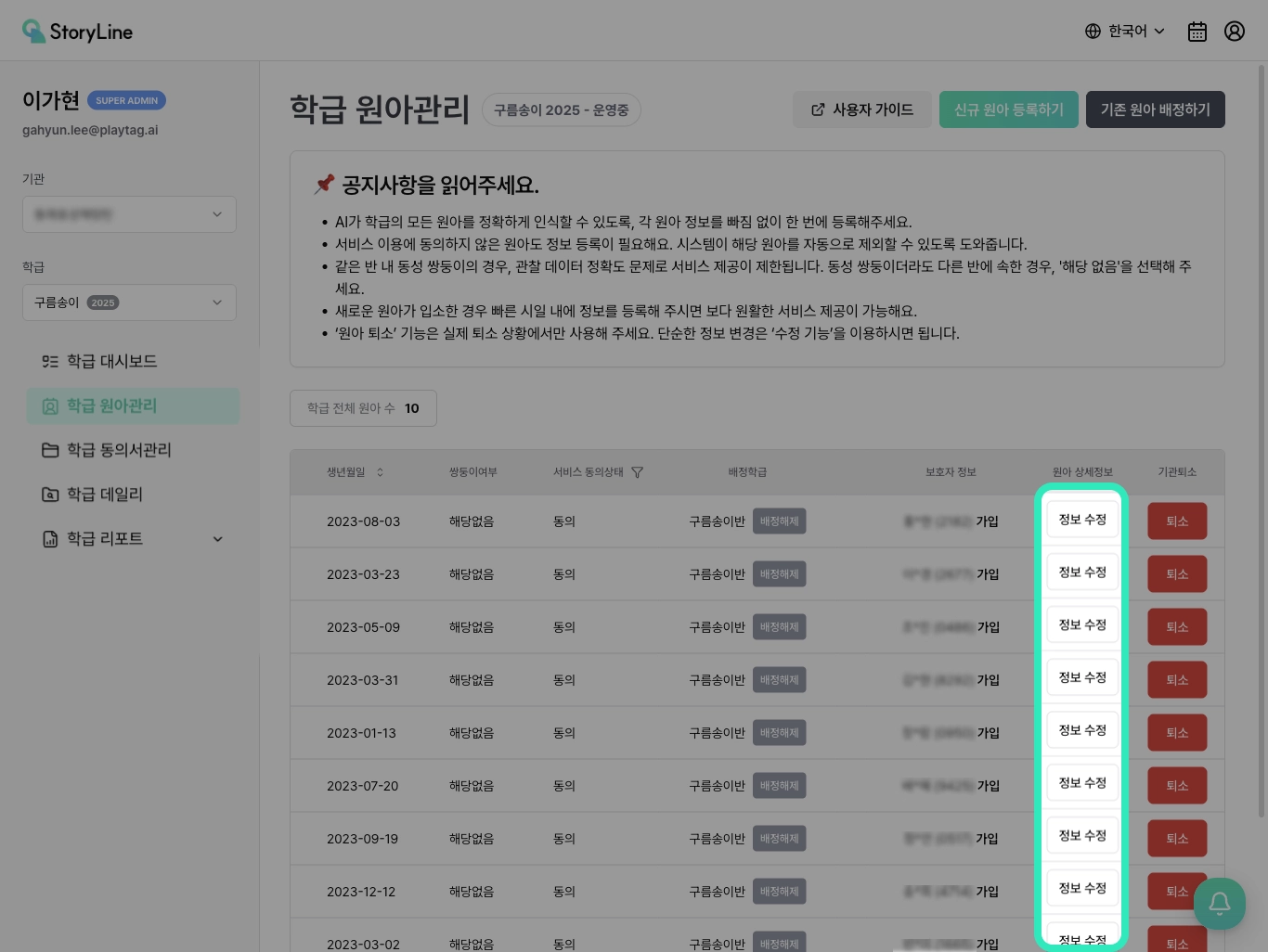 보호자 등록할 원아의 [정보 수정] 버튼 클릭
