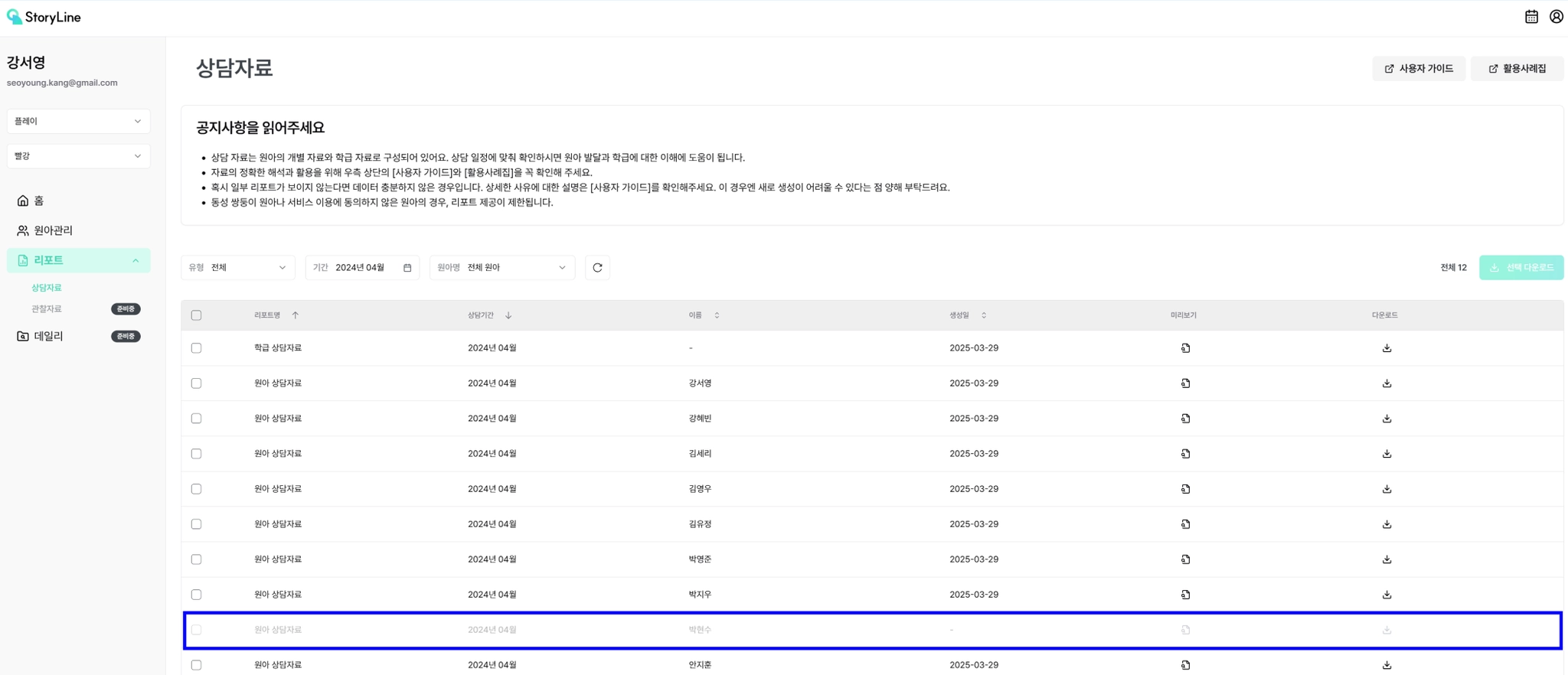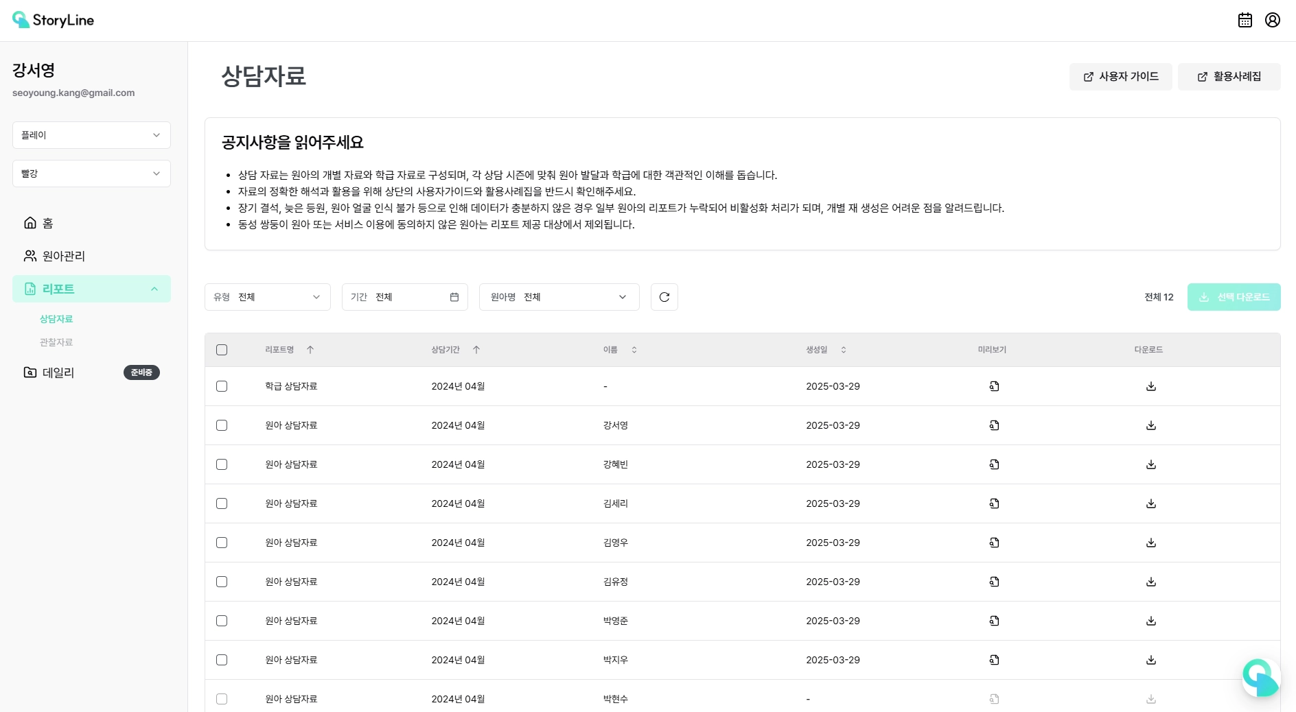 학기말까지 모든 상담자료를 받으셨다면, 원아별 리포트를 모아볼 수 있습니다.