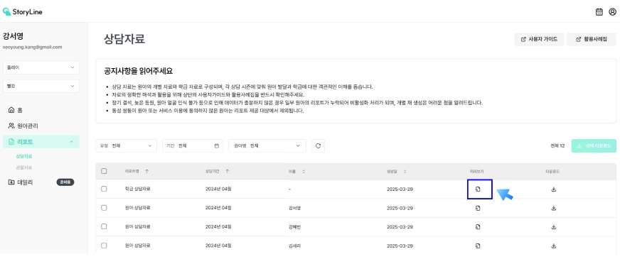 상담 자료는 미리보기 화면을 통해 확인하실 수 있으며, 이 화면에서 바로 다운로드도 가능합니다.