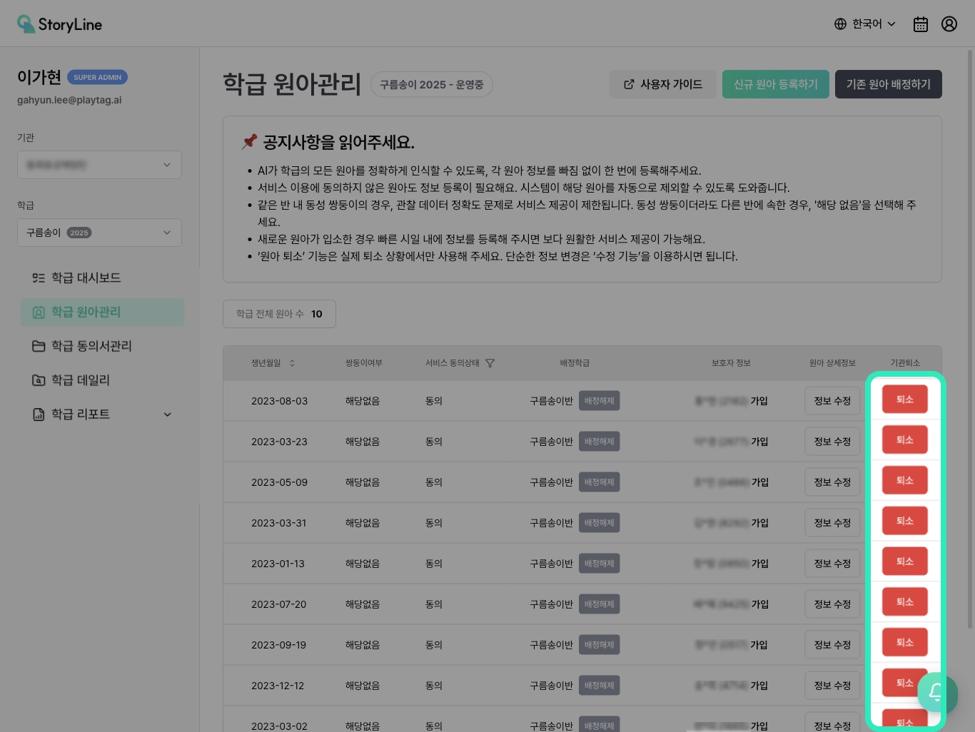 스토리라인 웹에서 원아 [퇴소]처리해주세요.